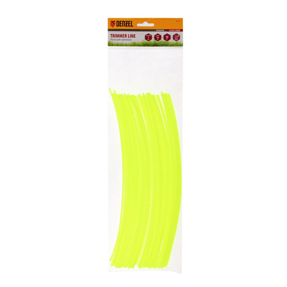 Нарезанная леска для триммера Denzel FLEX CORD 96104 с сечением «зубчатый квадрат», толщиной 3 мм и длиной 30 см, поставляется упаковками по 50 шт. и является сменным режущим элементом для триммерной головки. Применяется для срезания зарослей густой травы и сорняков с толстыми стеблями на участках большой площади. Леска устанавливается на бензотриммеры.