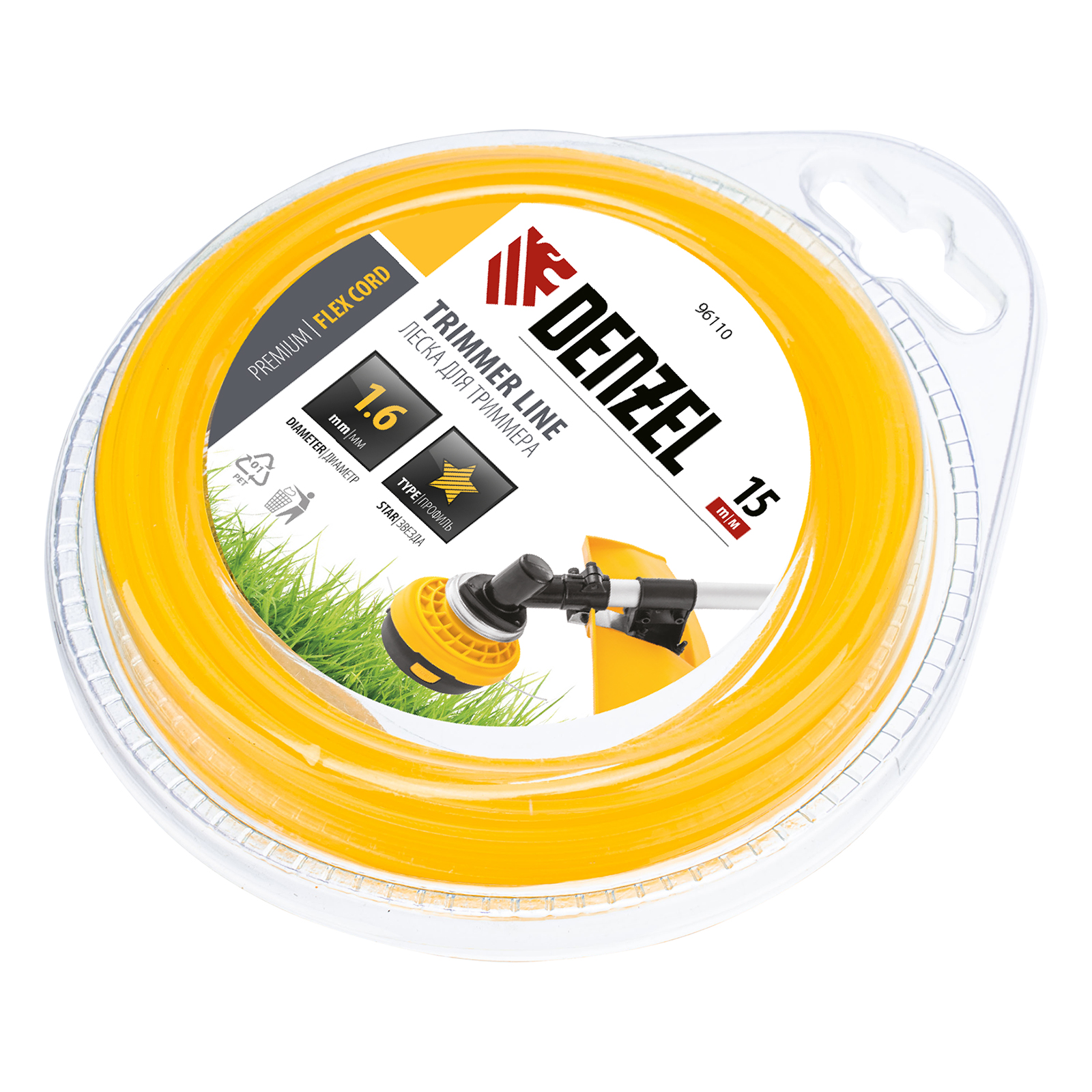 Леска Denzel FLEX CORD 96110 с сечением «звезда», диаметром 1,6 мм и длиной 15 м, поставляется в блистере и используется для электрических триммеров с нижним двигателем мощностью 300-600 Вт. Предназначена для стрижки газонной, густой или сухой травы с тонкими стеблями.