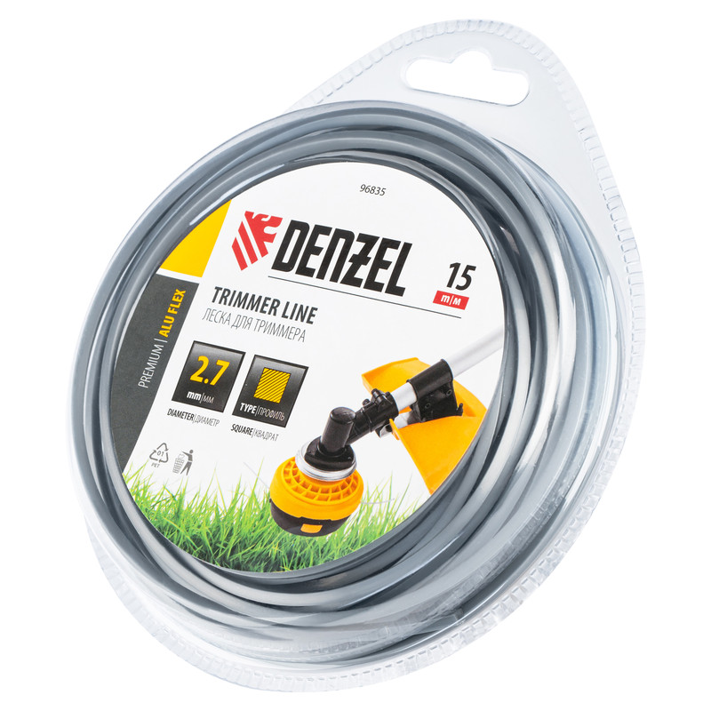 Армированная алюминием леска для триммера Denzel ALUFLEX 96833 квадратного сечения, толщиной 2,7 мм и длиной 15 мм, в блистере, предназначена для скашивания густой травы и растений с толстыми стеблями. Отличается повышенной износостойкостью. Заправляется в катушку бензинового триммера с объемом двигателя 25-52 см3. Леска будет полезна владельцам дачных участков.